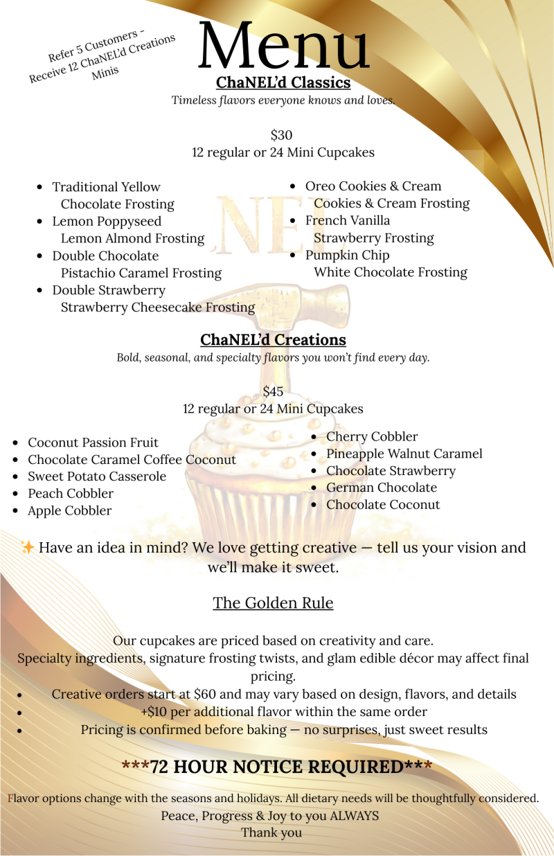 Chanel set out to reimagine what a bakery could be — trading rigid rules for inclusive indulgence. From classic cupcakes to gluten-free, vegan, sugar-free, and specialty creations, every recipe is thoughtfully developed so flavor is never sacrificed.